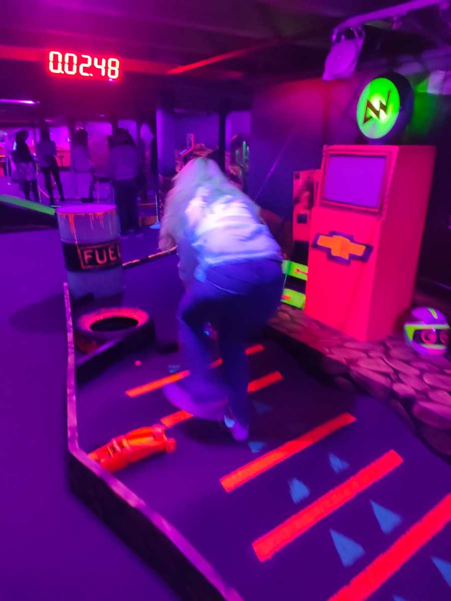 Dann ging es endlich los! Die Adventure Golf Anlage bot uns eine atemberaubende Kulisse. Die verschiedenen Bahnen waren kunstvoll gestaltet und führten uns durch eine fantasievolle Welt. Hindernisse, Brücken und knifflige Kurven sorgten für jede Menge Spaß und Herausforderung.