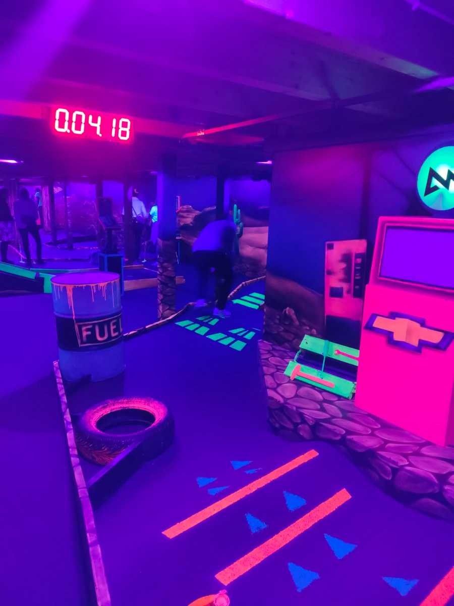 Dann ging es endlich los! Die Adventure Golf Anlage bot uns eine atemberaubende Kulisse. Die verschiedenen Bahnen waren kunstvoll gestaltet und führten uns durch eine fantasievolle Welt. Hindernisse, Brücken und knifflige Kurven sorgten für jede Menge Spaß und Herausforderung.